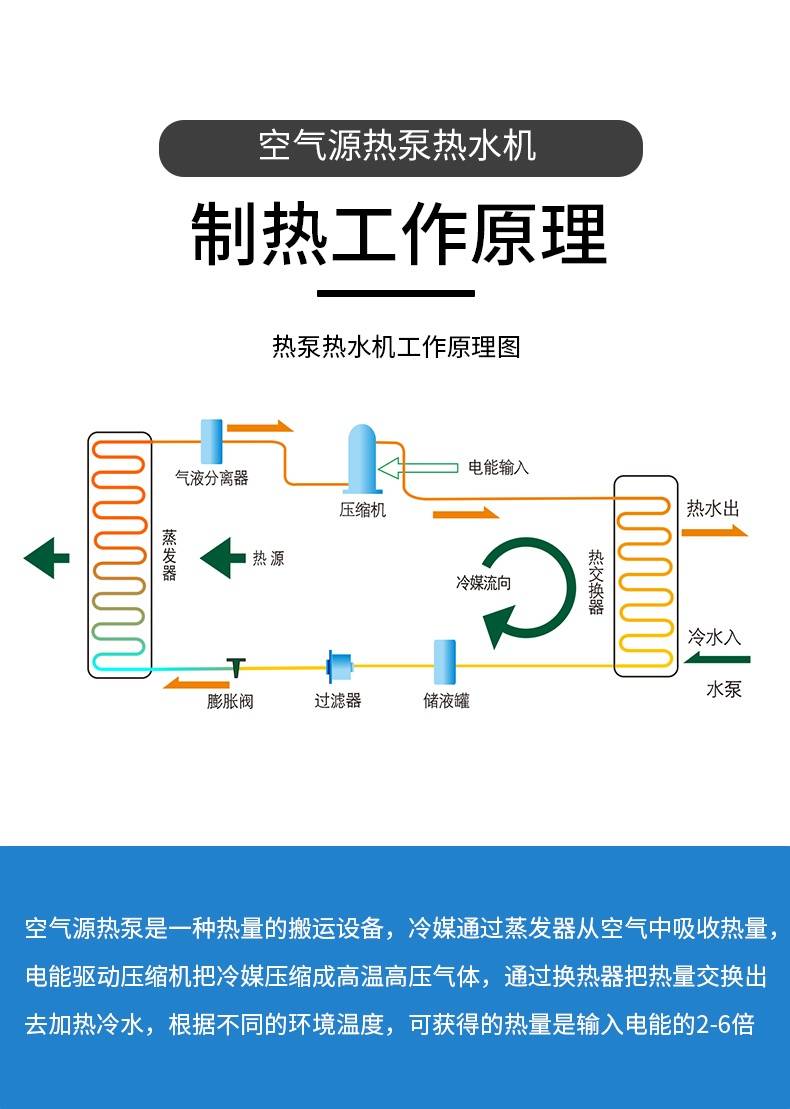 空氣源熱泵熱水機(jī)的工作過程:低溫低壓的液體→通過蒸發(fā)器吸收空氣中的熱量(氣化)→制冷劑變成低溫低壓的氣體→通過壓縮機(jī)做功壓縮→變成高溫高壓氣體→經(jīng)過換熱器跟水交換熱量→變成低溫高壓的液體→經(jīng)過節(jié)流裝置節(jié)流→變成變成低溫低壓的液體→進(jìn)入蒸發(fā)器重復(fù)循環(huán)過程。