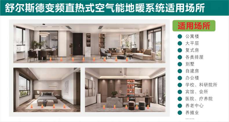 系統(tǒng)在環(huán)境溫度-25℃~45℃之間能正常工作,廣泛應(yīng)用于住宅( 公寓樓/別墅排屋/自建房等 )、小區(qū)配套、辦公室、醫(yī)院、療養(yǎng)院、浴室、高端賓館等場所的冬季采暖。